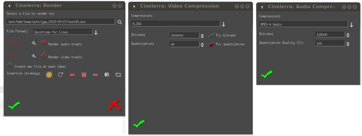 If all works well, the video should start encoding. To check if it is actually working, you must launch Cinelerra from the command line and look at the console output after you start rendering. You should see x264 command call printed and x264 should be running and printing stuff to the console. If something went wrong, you’ll see an error instead. If you can’t figure out what’s wrong from the output, leave a comment and I might try to help.