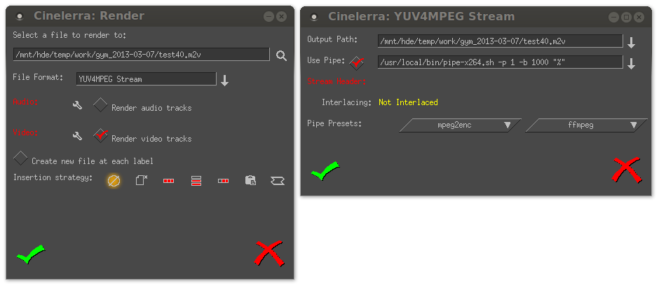 YUV4MPEG Stream allows us to pipe the video stream out of Cinelerra into an arbitrary tool chain. In this case the tool chain is my script that uses named pipes to encode the video with x264.